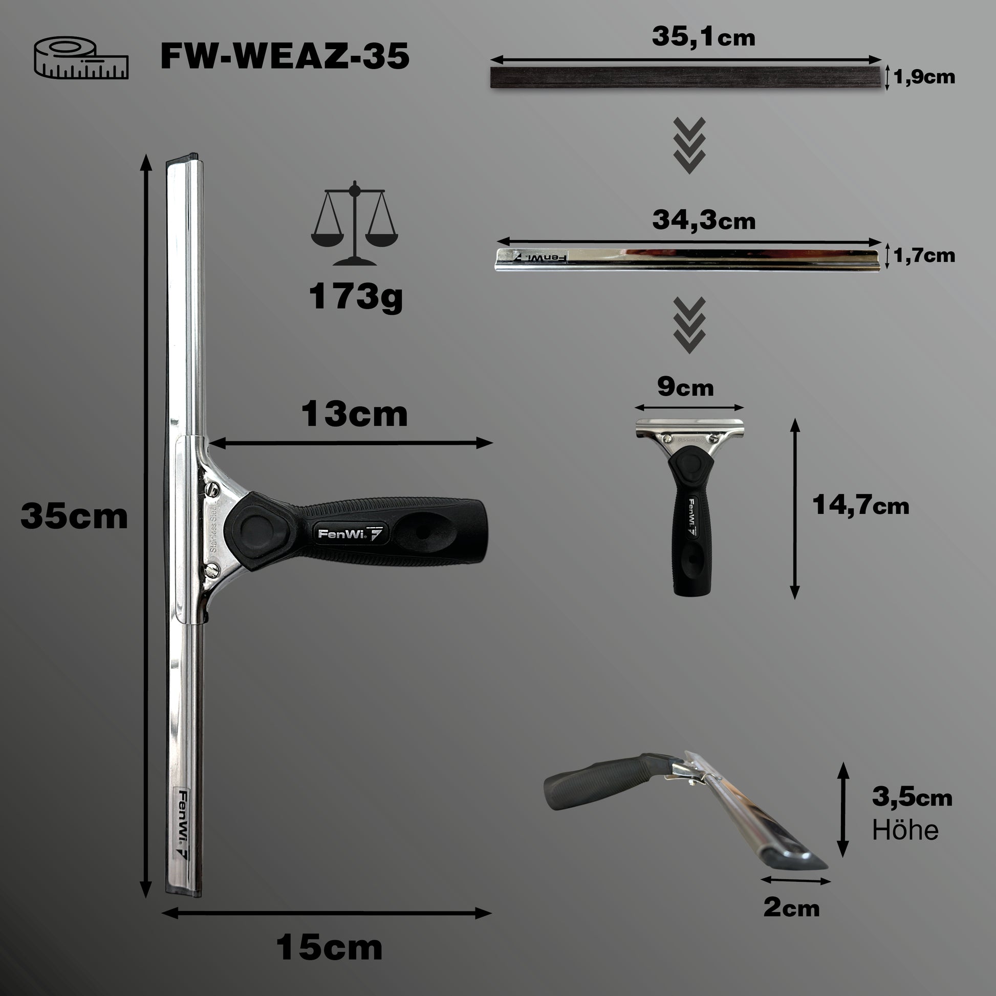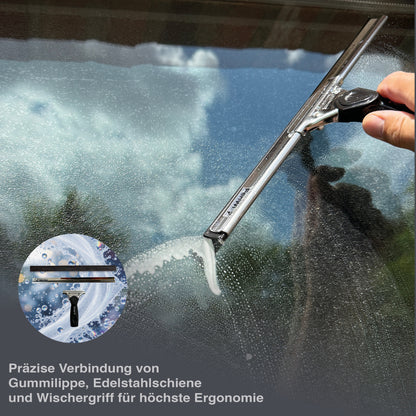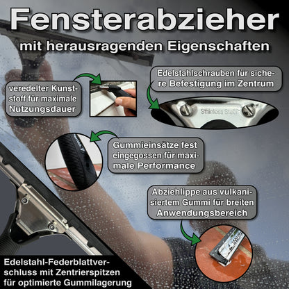 Bei diesem Reinigungsgerät handelt es sich um einen Profi Fensterabzieher. Dieser ist mit einem Edelstahl Federverschluss ausgestattet und wird incl. Gummilippe geliefert. Durch den Federblatt-Verschluss ist die Schiene stufenweise verschiebbar. Darüber hinaus sind die Gummilippen leicht wechselbar und man ist für einen späteren Austausch bestens gerüstet.