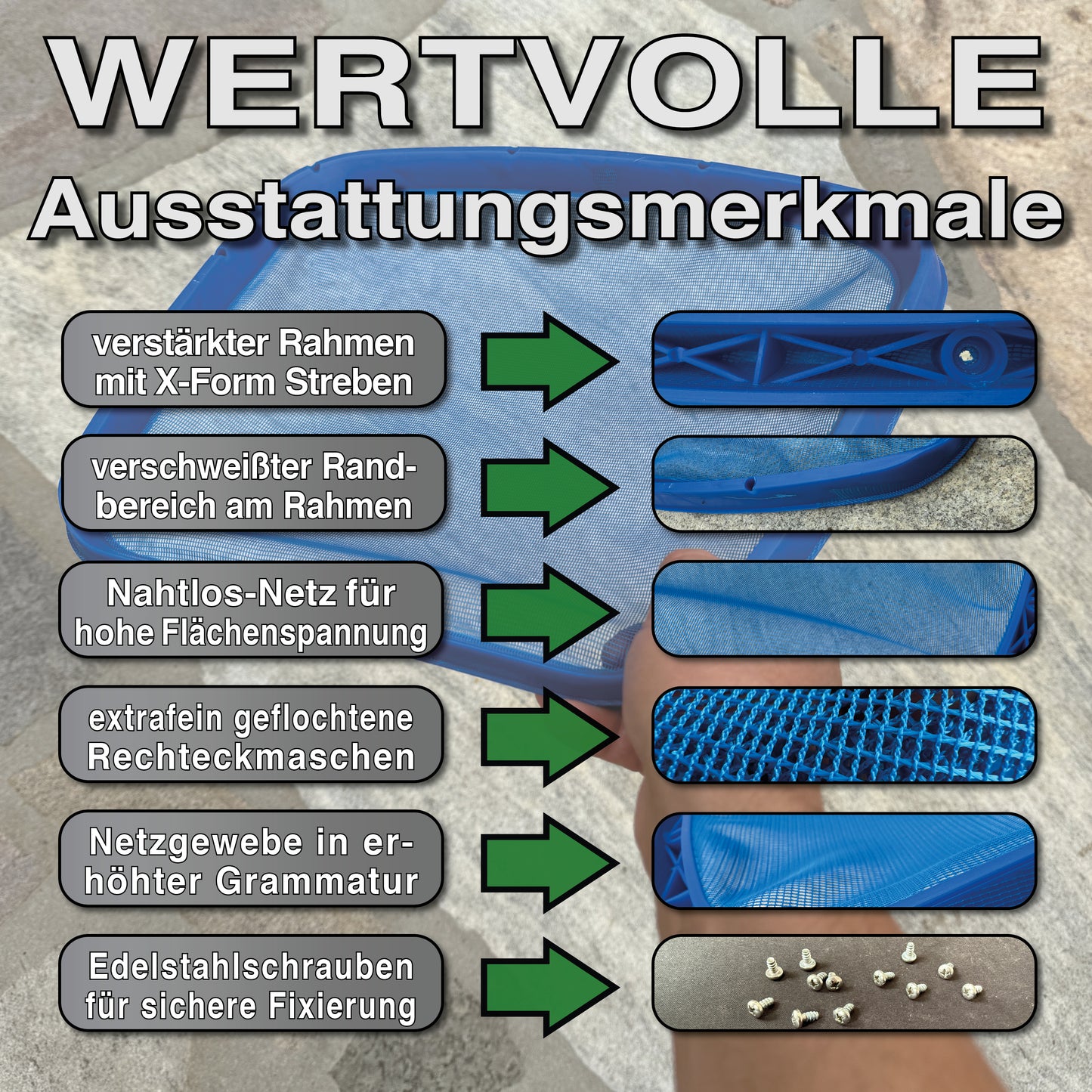 Die feinmaschigen Netzfelder bestehen aus geflochtenen Kunststofffasern und erreichen höchste Filterwerte sowie eine erhöhte Stabilität des Netzkorbes. Der Rahmen ist mit 12 Edelstahlschrauben befestigt und gestattet so den einfachen Austausch des Netzes, was ein wichtiges Qualitätsmerkmal darstellt.